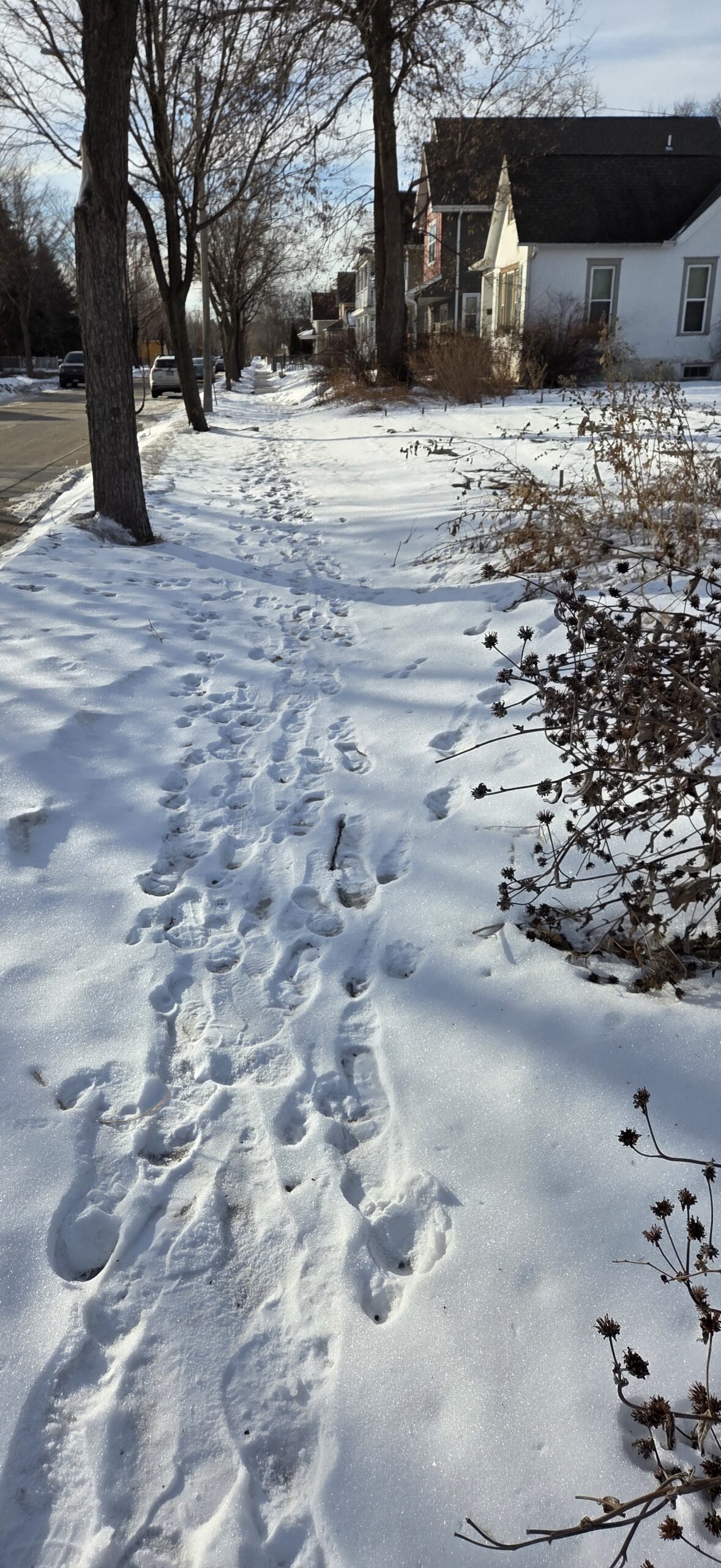Challenge # 2 – Tricky ground conditions! Snow and ice can make walking a challenge. It can really vary between sidewalks, running paths, different cities, and obviously paved vs dirt paths. Honestly, I find that non-paved surfaces tend to be great for running, as other runners, walkers, and bikers often trample down a solid trail, especially after a snowfall. They can be dicey if it has turned into ice, though. Sidewalks and paved trails can be a mismatch of clear pavement, solid ice, and crunchy snow that rolls your ankle! Slipping, rolling your ankle, and inconsistent stride length are all troubles to behold on the sidewalks.